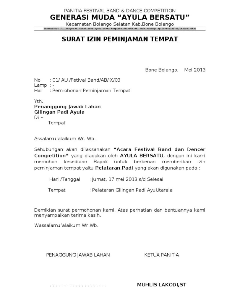 Informasi yang jelas tentang tanggal serta tempat pada surat . Contoh surat permohonan peminjaman lokasi kegiatan. Sistematika atau susunan surat permohonan izin kegiatan · kepala surat atau kop surat · tempat dan tanggal surat · nomor surat · lampiran · perihal · alamat atau . Sekolah sebagai sebagai lembaga non profit, tentunya sangat membutuhkan pihak lain. Contoh surat izin peminjaman tempat.