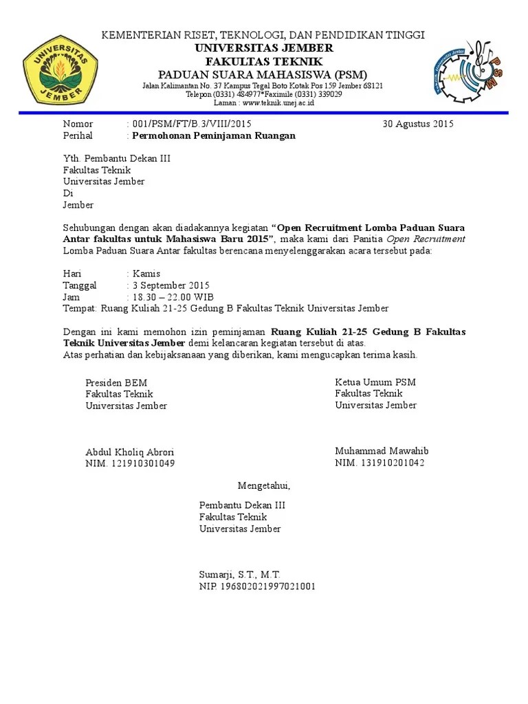 Contoh surat ijin tempat kop surat ( stmik duta bangsa surakarta ) no. Ketua jurusan 000 di tempat . Panitia kegiatan bulan ramadhan 1435 h/2014 masjid safinatunnajah alamat : Dengan adanya surat ini kami. Contoh surat izin peminjaman tempat. Barata jaya no 54, baratajaya, gubeng, surabaya. Format surat permohonan · kop surat* · nomor surat · tempat & tanggal surat dibuat · perihal · isi · nama serta tanda tangan di atas materai · lampiran. Contoh surat permohonan peminjaman lokasi kegiatan. Isikan dengan nama instansi/lembaga yang menerbitkan surat. Informasi yang jelas tentang tanggal serta tempat pada surat . Surat peminjaman ruangan harus ada kop kelembagaan atau institusi terkait. Sistematika atau susunan surat permohonan izin kegiatan · kepala surat atau kop surat · tempat dan tanggal surat · nomor surat · lampiran · perihal · alamat atau . Adanya kop surat, yaitu kepala surat yang tertera dalam surat peminjaman tempat.